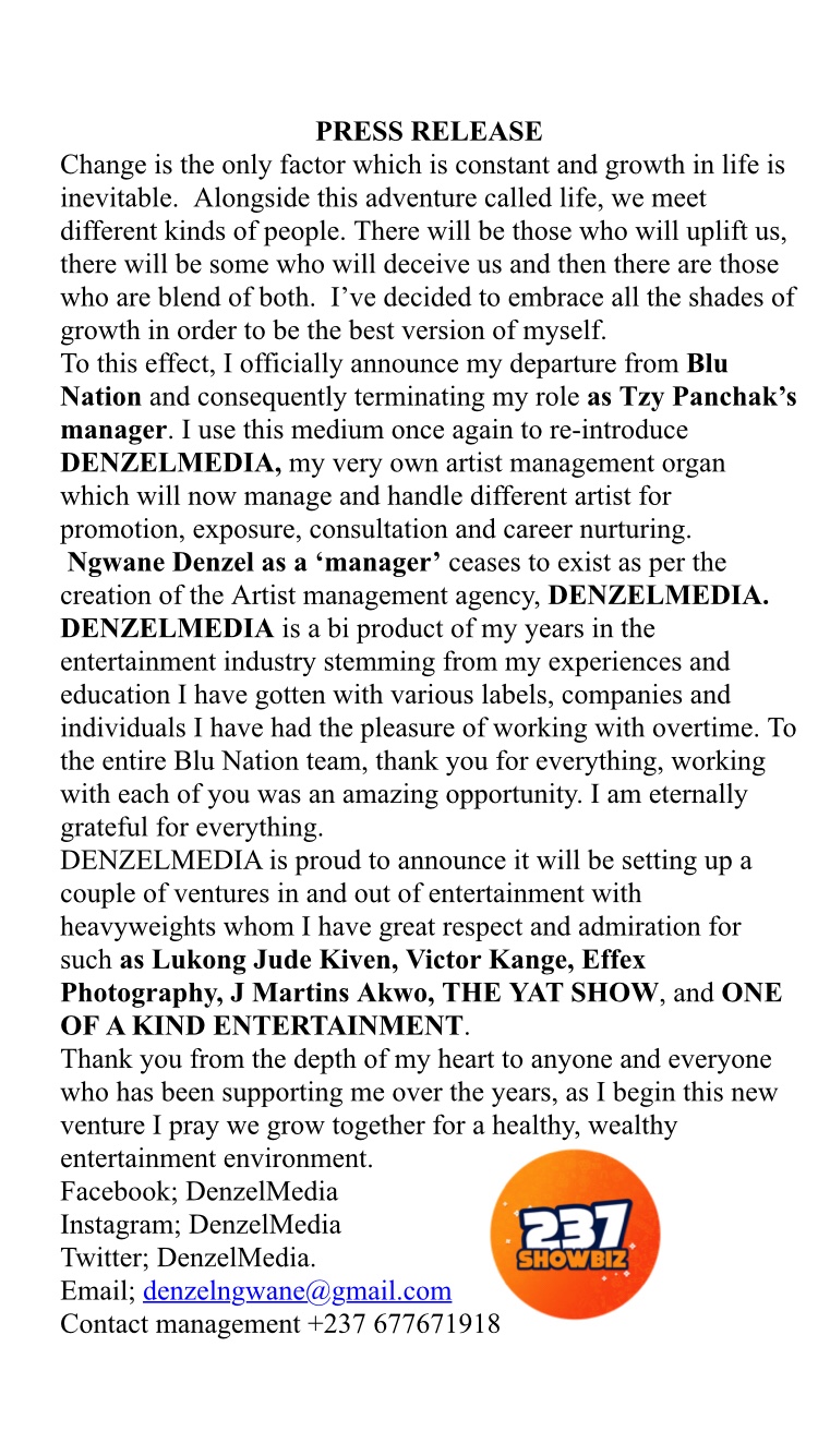 Ngwane Denzel of Denzel Media pulls out the plug which connected him to US Based Cameroonian Record Label Blu Nation as Artiste Manager and P.A of Cameroonian singer Tzy Panchak. While we thought the new year will come with a lot of good tidings and more positivity from every sector, the year 2019 begins bad as the label’s lone manager quits! We recently saw the label scouting for younger talents to sign in order to broaden their camp. However, Ngwane Denzel decided to call it off with his former team despite the great moves ahead!