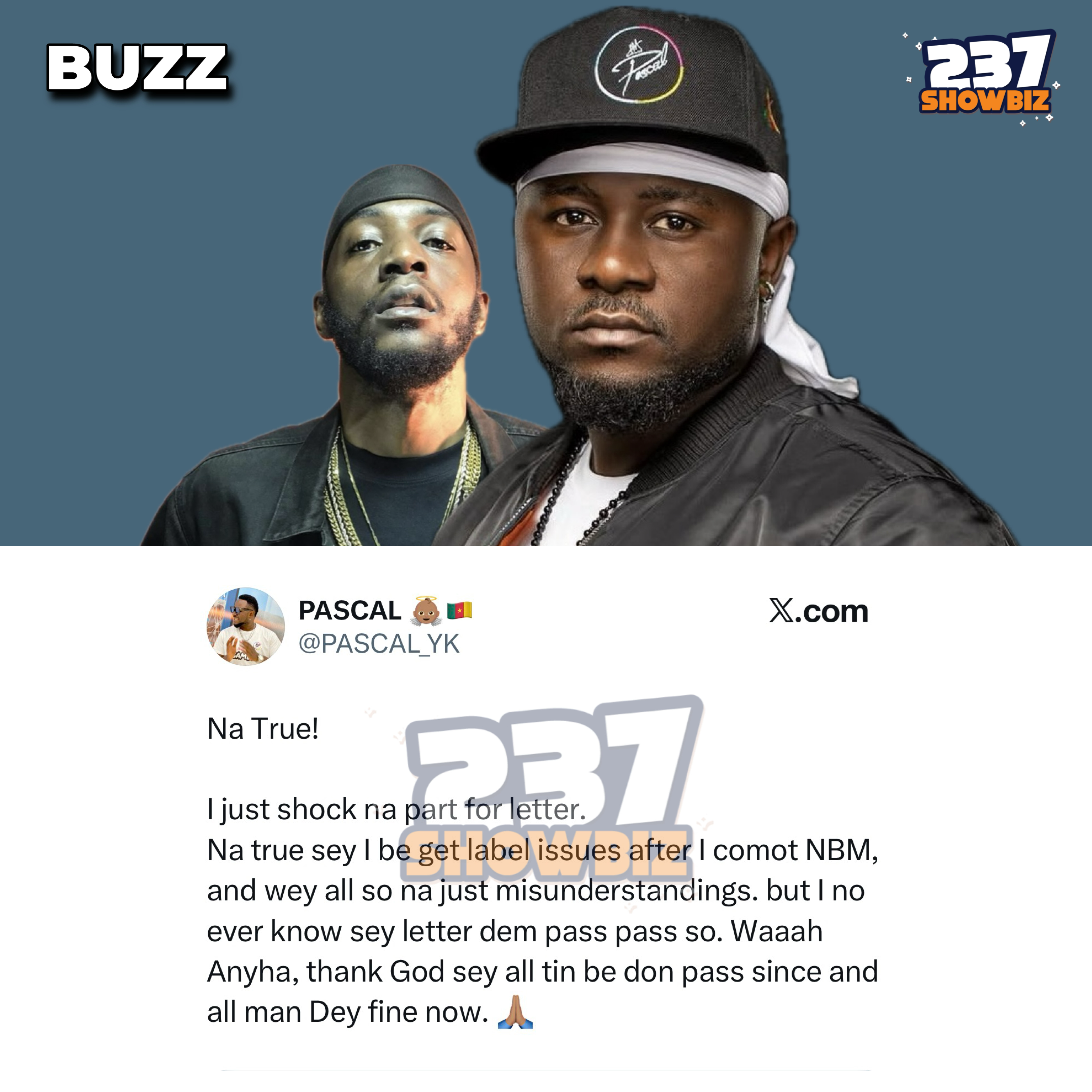 “Na true!” Pascal stated. “I just shock na that part for letter. Na true say I be get label issues after I comot New Bell Music and wey all so na just misunderstanding, but I no ever know say letter dem pass pass so. Anyha! Thank God say all thing be don pass and all man dey fine now.”